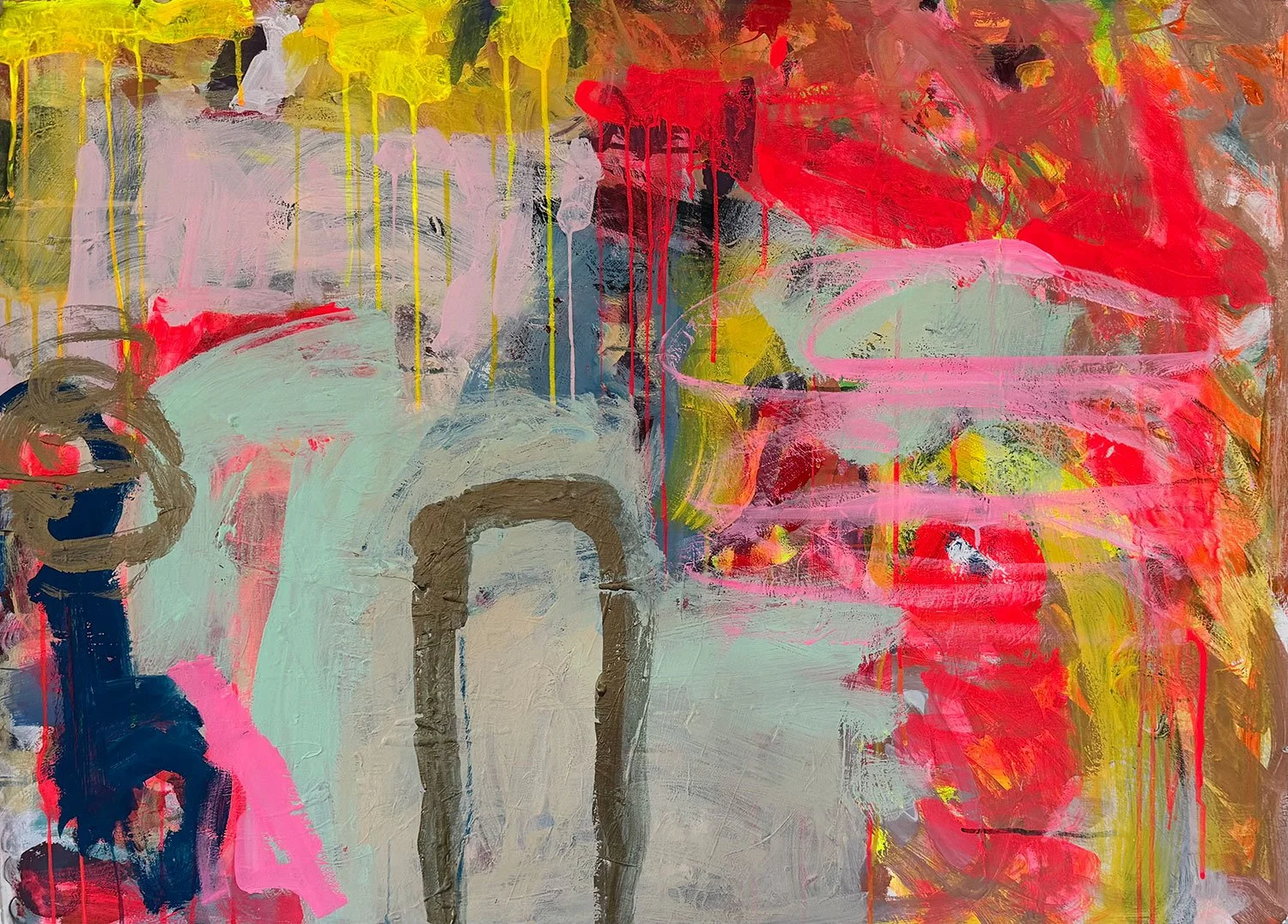“Showing Up” is about arriving from a place of unexpectedness. There are sudden splashes, quiet surprises, and moments that feel like small miracles. Some elements only emerge later, becoming more visible over time. Paint matters deeply to me, whether oil or gouache, as does the surface itself. My paintings are a doorway into my daily life. I have tried to stop, but I cannot live without it.