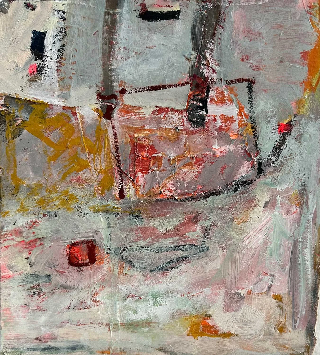 “After traveling the narrow, curvy mountainside roads of the Greek Islands for two months this past summer, the stonewalls and shack-like structures stayed with me back at my studio in Provincetown. The small houses and storage huts sprinkle over the hand made terraced farms and aid me in continuing my abstracted attraction to the square forms. The florescent colors of my paintings are the highlights of Greek culture and their vibrant activities shared with family and friends.”